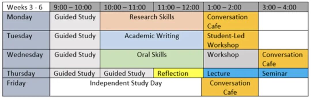 语言班的课程内容是非常多样的,包括 研究技巧、学术写作、口语表达技巧等。授课学习形式包括小组讨论、自由对话、lecture、seminar等。