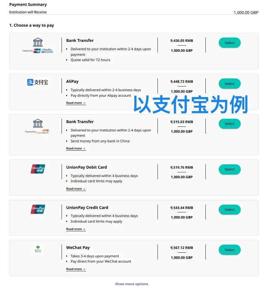 选择支付方式,请注意右侧人民币支付金额,不同支付渠道的金额会略微有所不同。