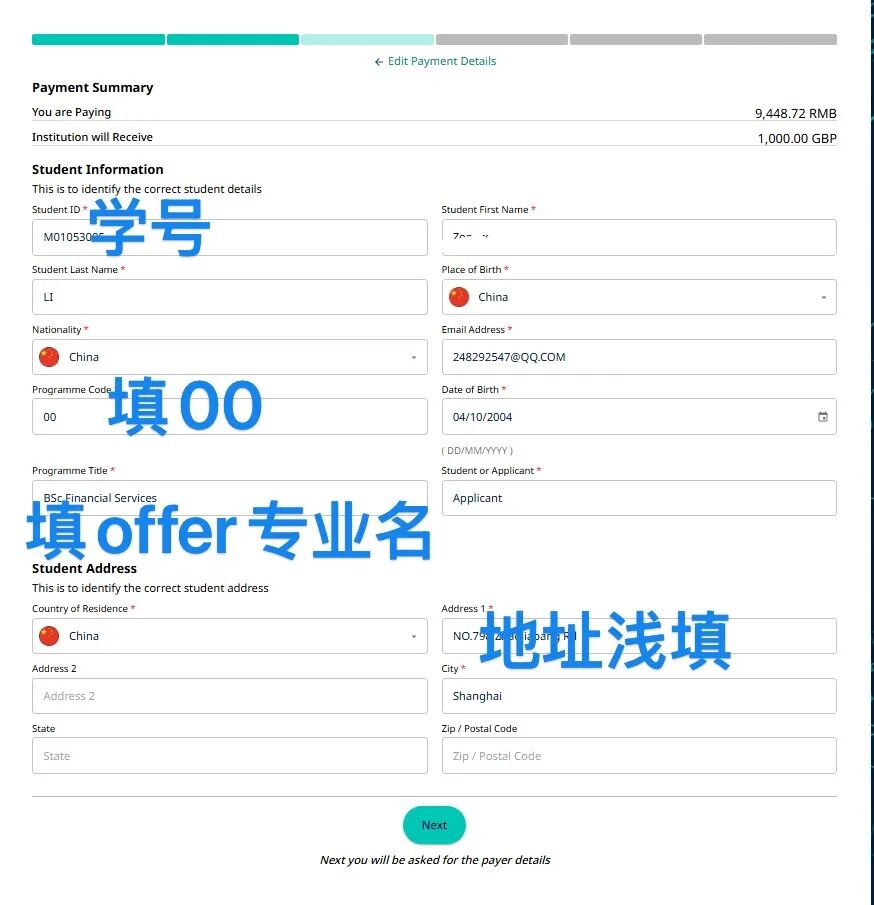 请准确无误填写下方个人信息,填写错误将会影响到学费/押金入账。