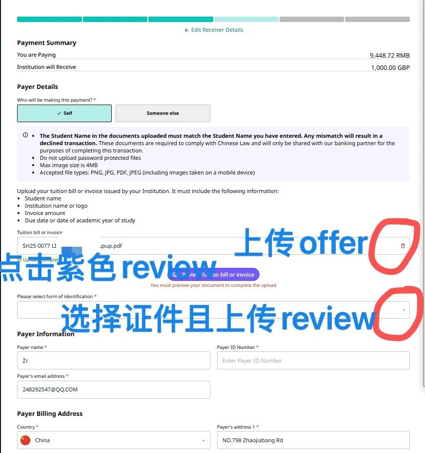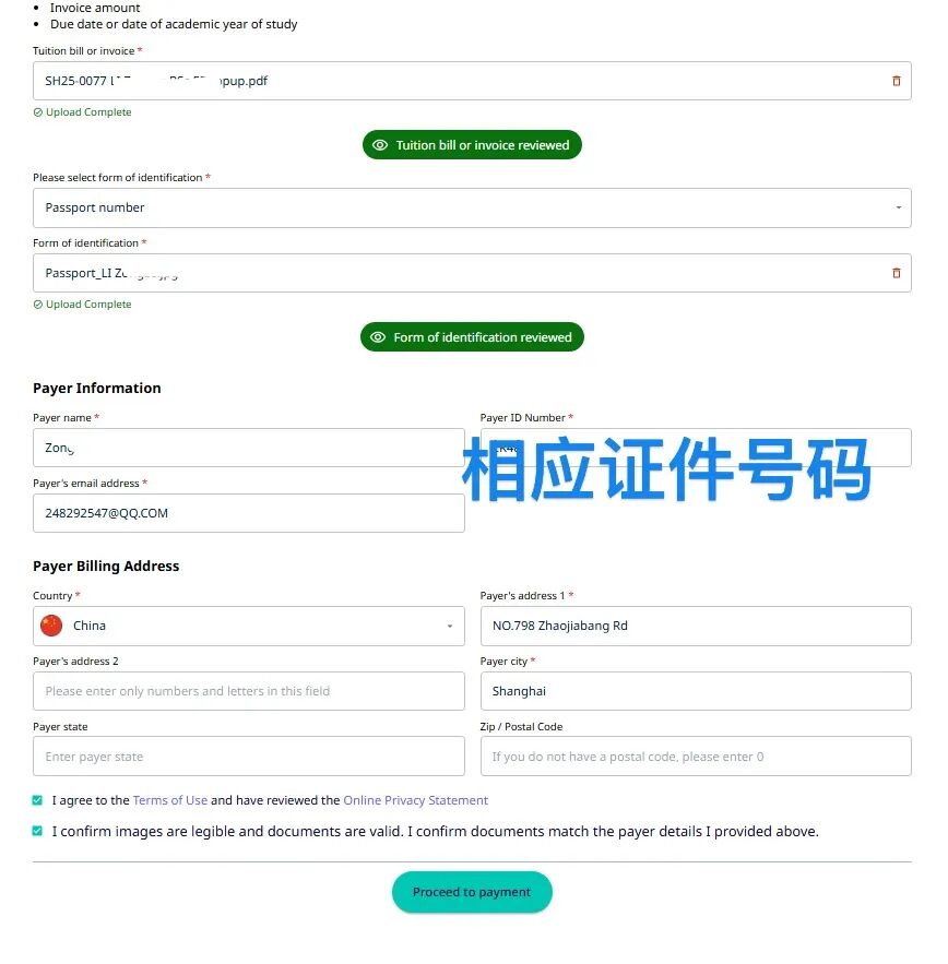 填写付款人相关信息并上传缴费材料。