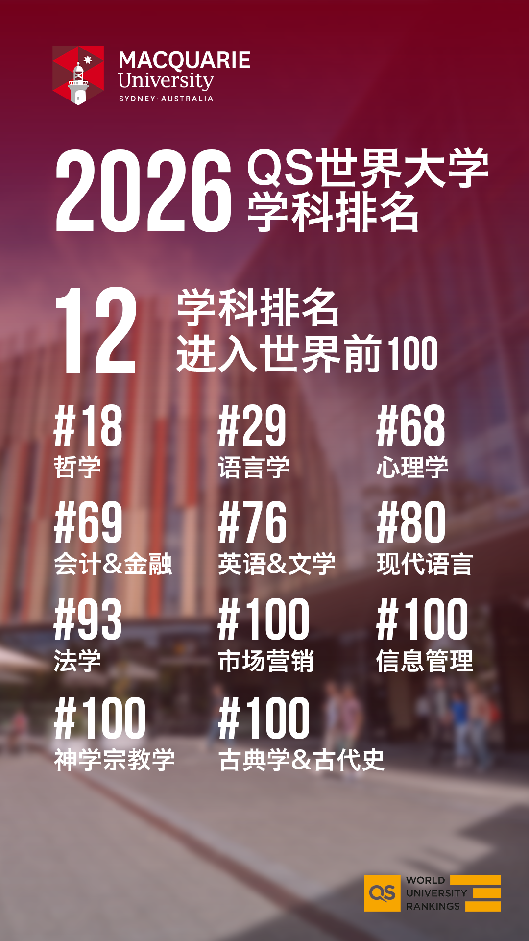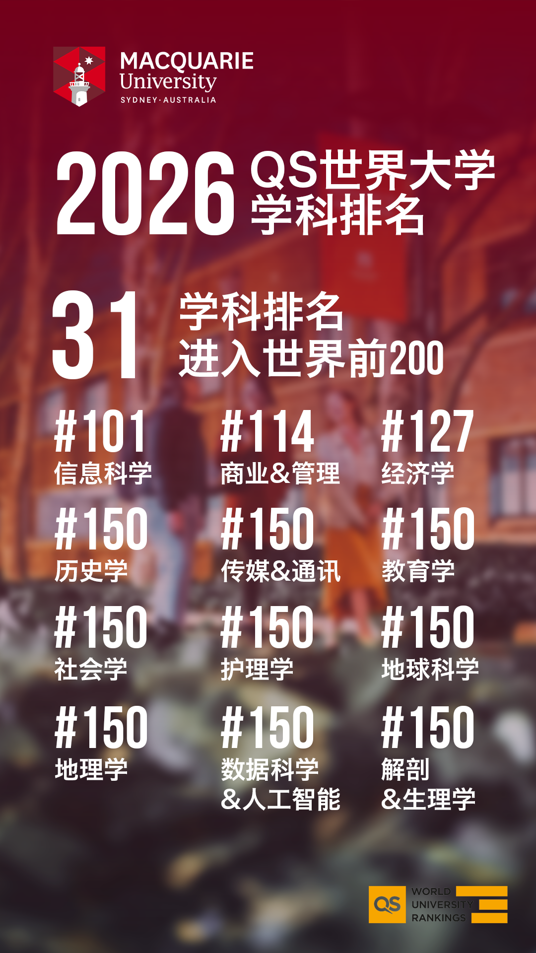 重磅消息!QS2026科目排名出炉!麦考瑞大学再次取得优秀排名!更多课程进入世界Top 100行列!