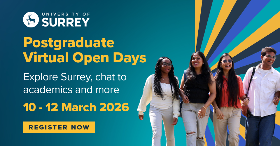萨里大学将于2026年3月10日(星期二)至3月12日(星期四)举行研究生课程线上开放日(Postgraduate Virtual Open Days)活动,让你足不出户即可深入了解萨里大学研究生课程的独特优势,亲身感受英国顶尖学府的校园氛围。欢迎来自世界各地的你与我们一同参与这场为期三天的沉浸式学术之旅!