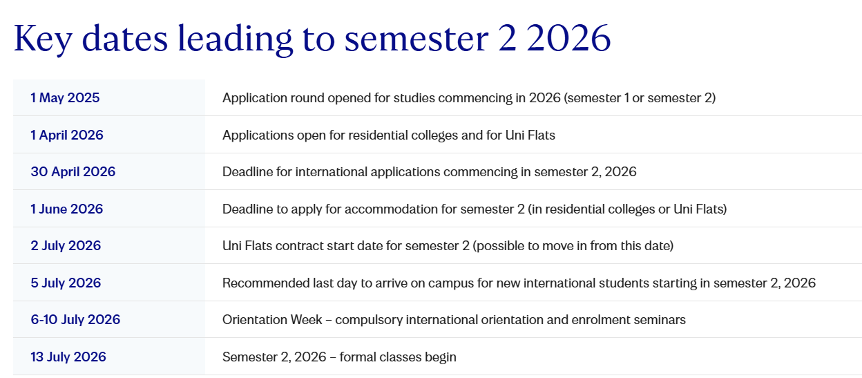 Semester 2 2026 accommodation applications open on 1 April 2026.