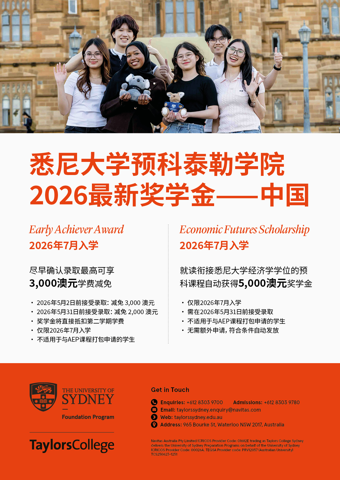 Navitas Australia Pty Limited (CRICOS Provider Code: 01682E) trading as Taylors College Sydney delivers the University of Sydney Preparation Programs on behalf of the University of Sydney (CRICOS Provider Code: 00026A, TEQSA Provider code: PRV12057 (Australian University)).