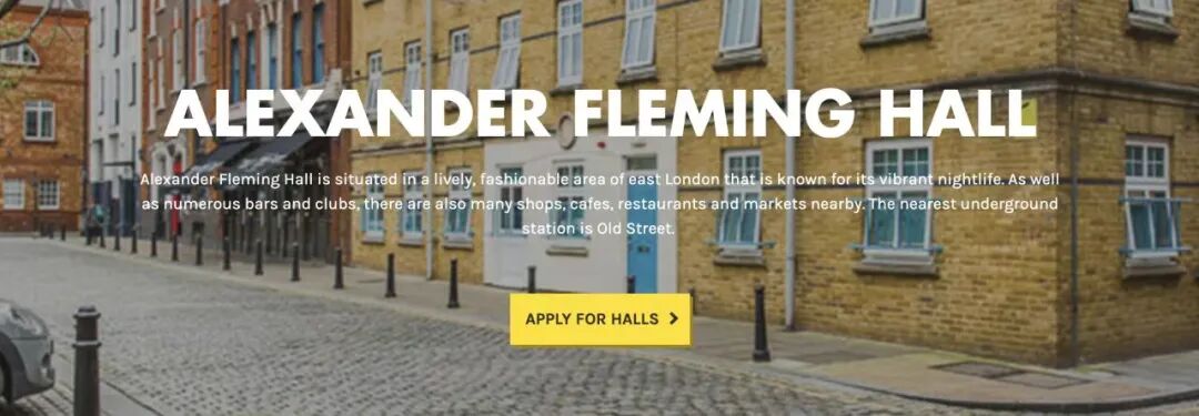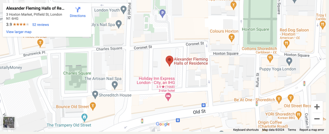 Alexander Fleming Hall 学生宿舍位于伦敦一区的东部,附近的地铁站为 Northen Line 的 Old Street。这里是伦敦时尚动感十足的时髦区,拥有众多独立市场、餐厅和咖啡店,周边也有很多酒吧,大家可以轻松享受伦敦精彩的夜生活。