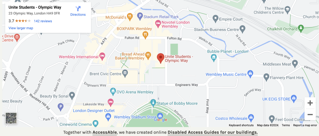 Olympic Way 学生公寓,距离 Wembley Park 地铁站仅5分钟步行距离,坐地铁到伦敦市中心贝克街仅需12分钟。周边娱乐、休闲设施齐备,有一大批吃喝玩乐的好地方等你去探索。