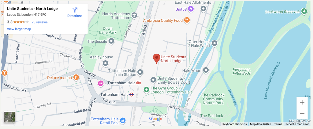 North Lodge 坐落于伦敦北部的托特纳姆黑尔区(Tottenham Hale),这里依傍莱亚河 (River Lea),绿树成荫,充满活力。你可以在附近找到各种时尚的咖啡馆和一流的餐厅,体验丰富的展览和博物馆,感受多元文化与生活乐趣。