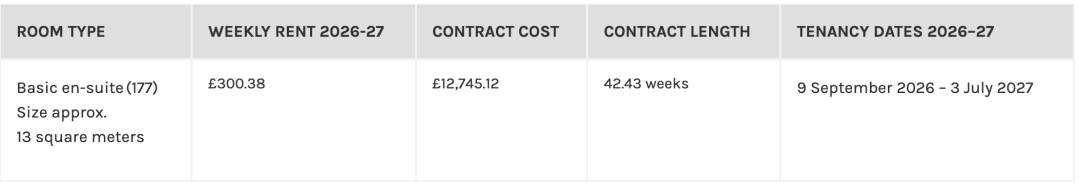 *注:en-suite 即室内有独立卫生间的宿舍;studio是带开放式厨房的宿舍